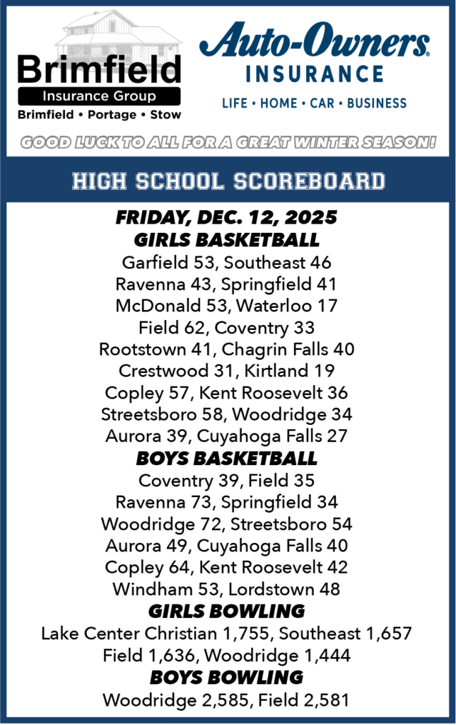 HIGH SCHOOL SCOREBOARD FRIDAY, DEC. 5, 2025 GIRLS BASKETBALL CRESTWOOD 35, CHAGRIN FALLS 34 (At Crestwood) CHAGRIN FALLS (34) — O. Kruse 3 2 8; A. Kay 2 0 5; A. Russell 6 3 17; Z. Thompson 0 0 0; G. I. Levey 1 0 2; L. Radamsky 0 0 0; S. Lgoe 1 0 […]