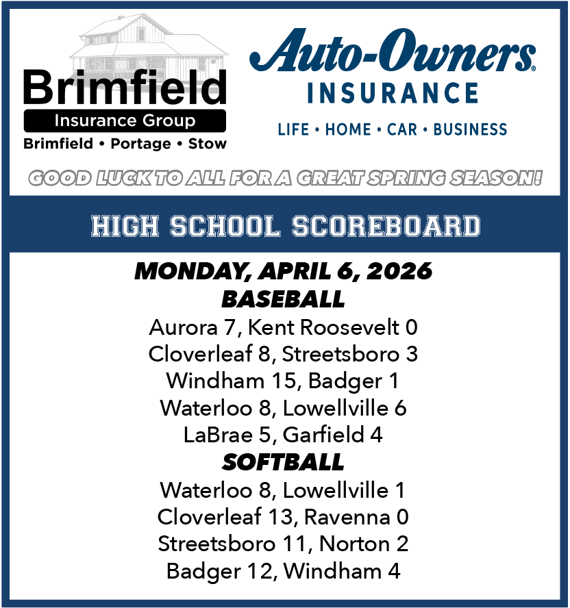 HIGH SCHOOL SCOREBOARD MONDAY, APRIL 6, 2026 BASEBALL AURORA 7, KENT ROOSEVELT 0 (At Aurora) ROOSEVELT 000-000-0—0-3-2 AURORA 151-000-X—7-13-0 Batteries: Polcha, Poluga (3) and Abercrombie. Cooch, Scott (6), Zembala (7) and Wamser, B. ...
