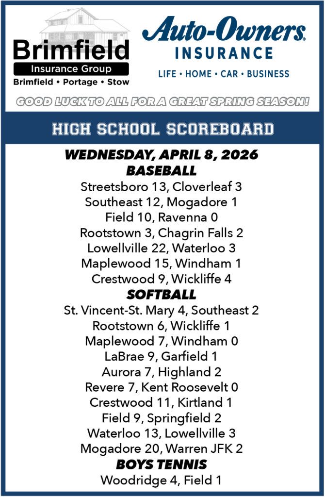 HIGH SCHOOL SCOREBOARD WEDNESDAY, APRIL 8, 2026 BASEBALL STREETSBORO 13, CLOVERLEAF 3 (At Streetsboro) CLOVERLEAF 003-000—3-2-3 STREETSBORO 930-001—13-11-2 Batteries: Matheney, Smykowski (1), Yager (5), Kilgore (5), Behary (6) and C. Baltic. Long, Burfield (5) and DeToro. Top Hitters: (C) Tolley, single, RBI; Behary, single, run. (S) Long, two singles, three RBI, run; Coffie, […]