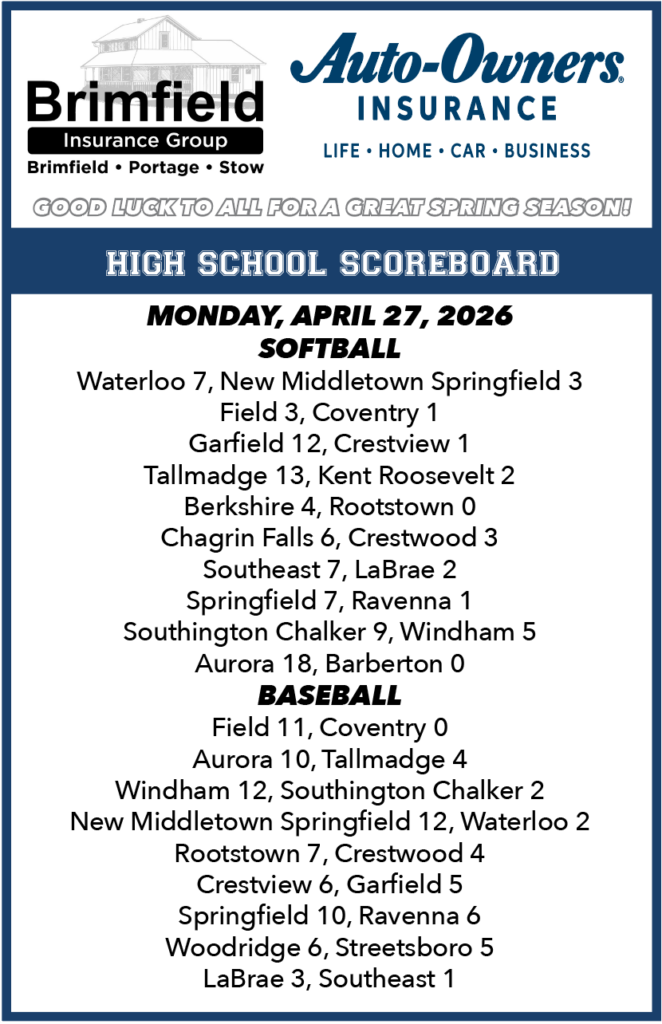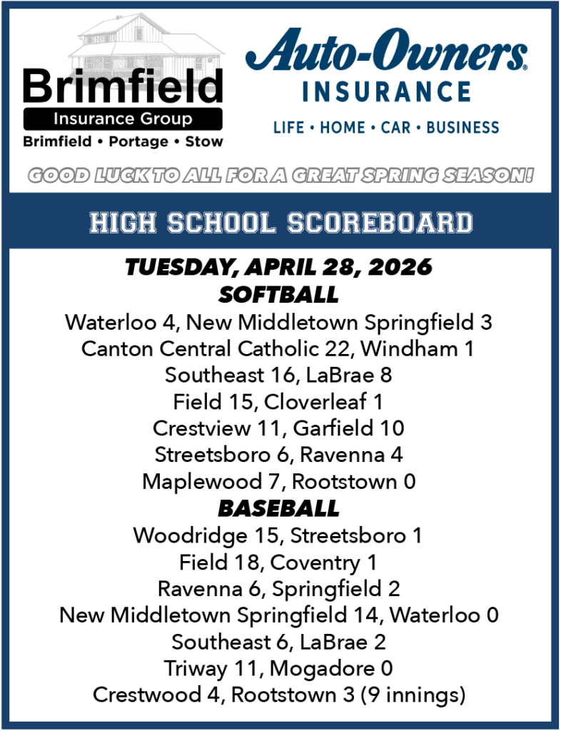 HIGH SCHOOL SCOREBOARD TUESDAY, APRIL 21, 2026 BASEBALL WARREN JFK 10, MOGADORE 3 (At Warren JFK) MOGADORE 100-020-0—3-4-7 WARREN JFK 060-004-X—10-5-3 Batteries: J. Hopkins and Pendergast. LaPolla and Snyder. Top Hitters: (M) Smith, two singles, run; J. Hopkins, single, RBI. (JFK) LaPolla, triple, two RBI, two runs; Snyder, single, two RBI, run; Rinck, […]